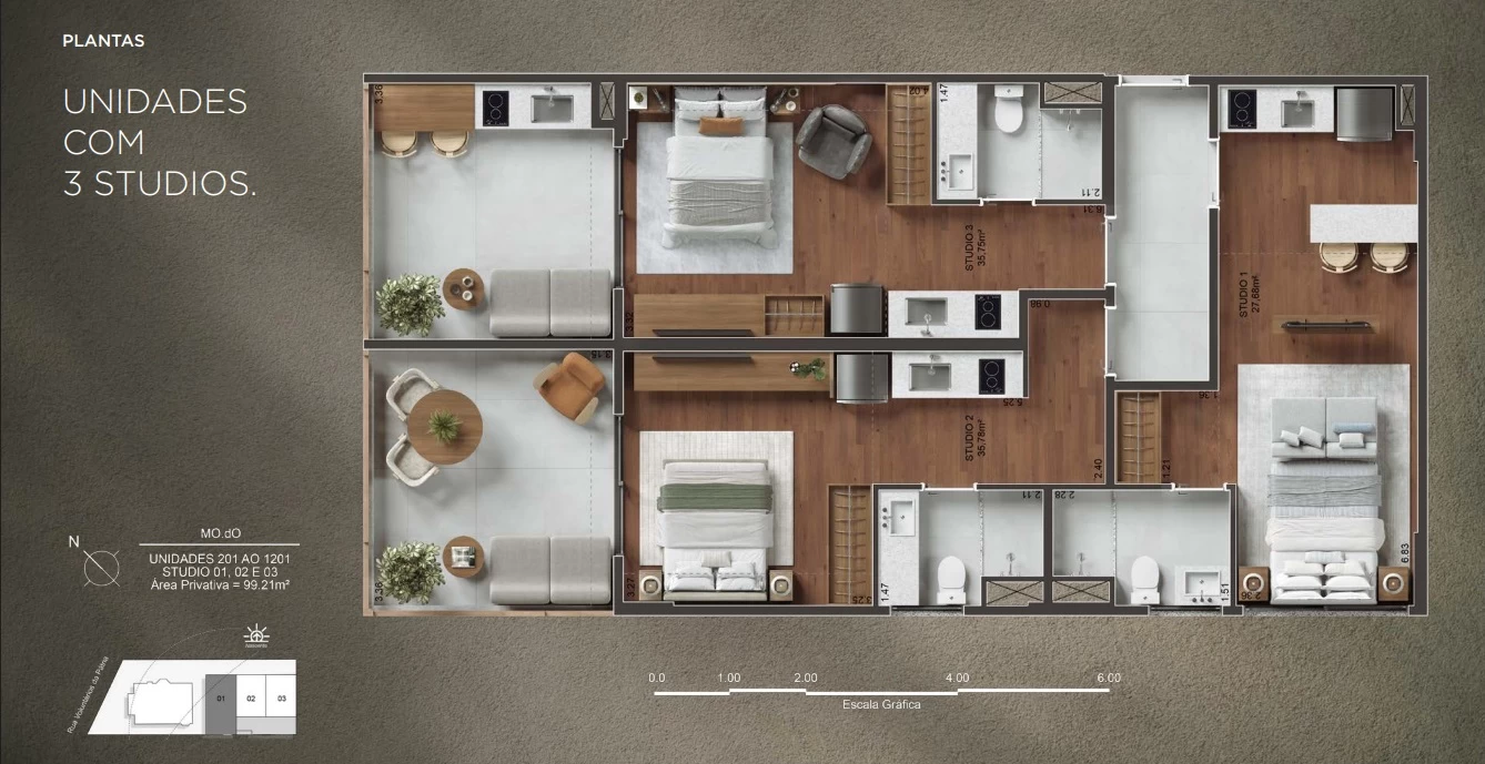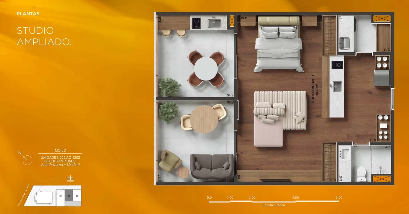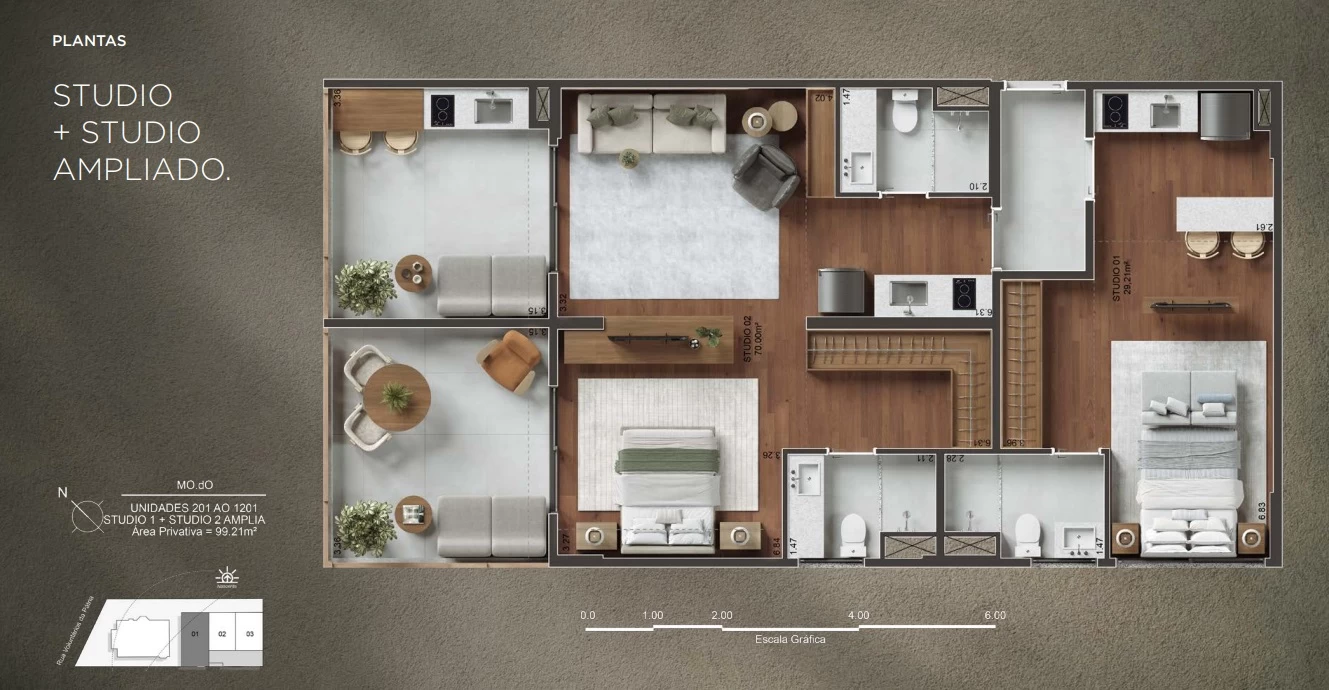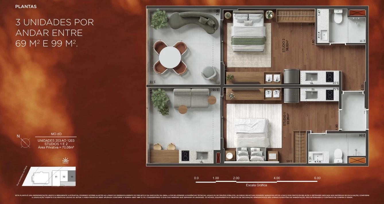 Unidades com 2 Studios com 69m² e 70m².